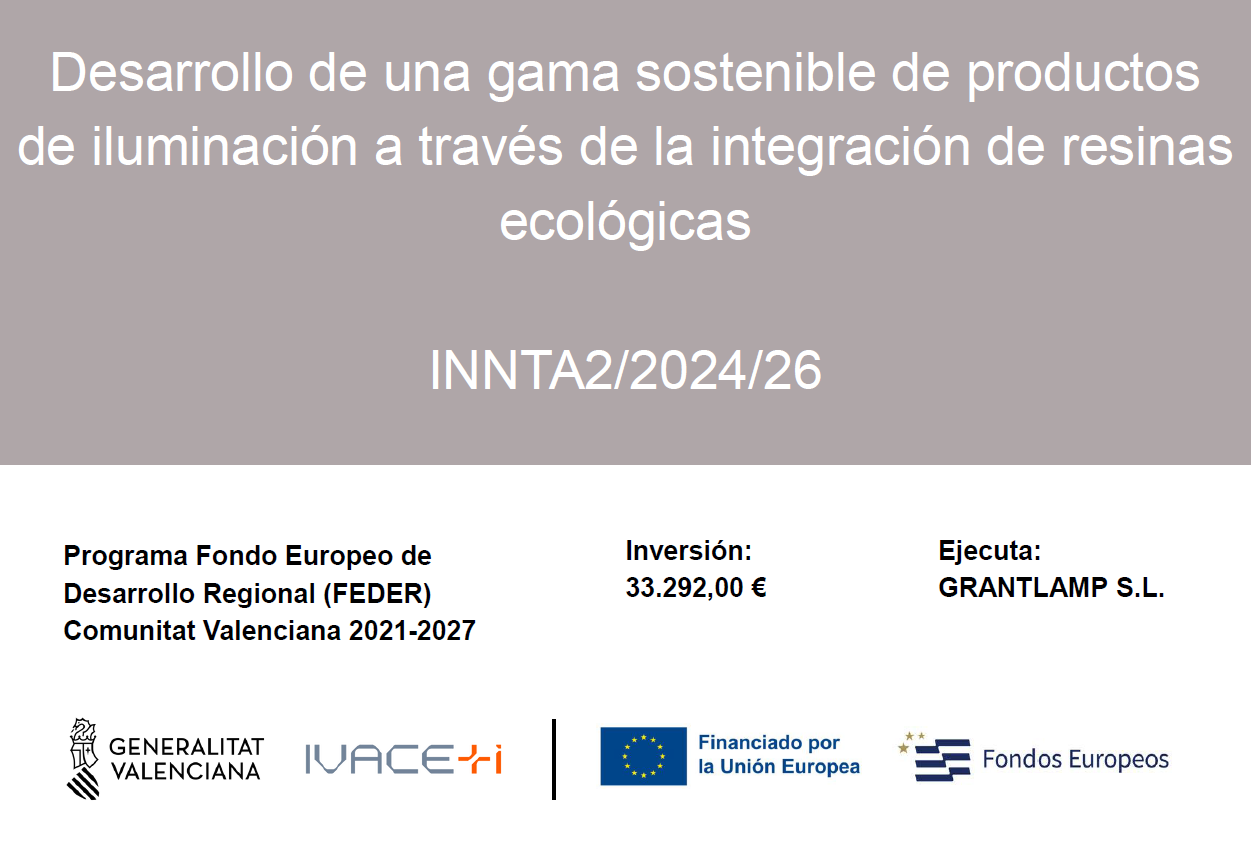 Grantlamp ha recibido una ayuda con cargo al Programa Promoción del Talento: “Línea 2. Incorporación de personas investigadoras y tecnólogas para proyectos de innovación en empresas (Incorporación). Sublínea 2.1. ‘Contratación’ del Instituto Valenciano de Competitividad e Innovación (Ivace+i). El proyecto se centra en el diseño de una nueva gama de lámparas decorativas que utilizan resinas ecológicas como componente principal. Esta iniciativa ha dado lugar a una gama de productos que incluye una lámpara de pie, una de sobremesa y una colgante, concebidas para introducir en el mercado soluciones innovadoras y sostenibles elaboradas con resinas ecológicas integradas.